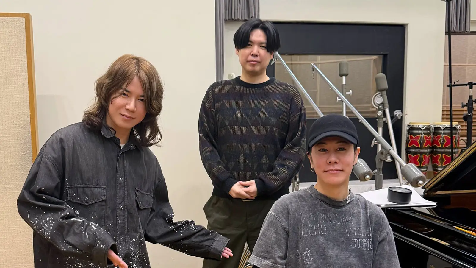 左から、主題歌・エンディング主題歌・BGM作曲担当の藤永龍太郎さん、BGM作曲担当の菊田大介さん、ピアノ演奏の岸田勇気さん。