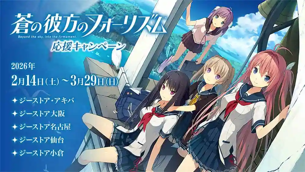 TVアニメ「蒼の彼方のフォーリズム」10周年記念キャンペーンを全国のジーストアで開催。関連グッズ販売のほか、長崎県五島市で行われる「スペシャルトーク&ライブ」のチケットも販売。商品購入・予約者にはミニフォト風カードをプレゼント。チケット購入者にも特典あり。(要約)